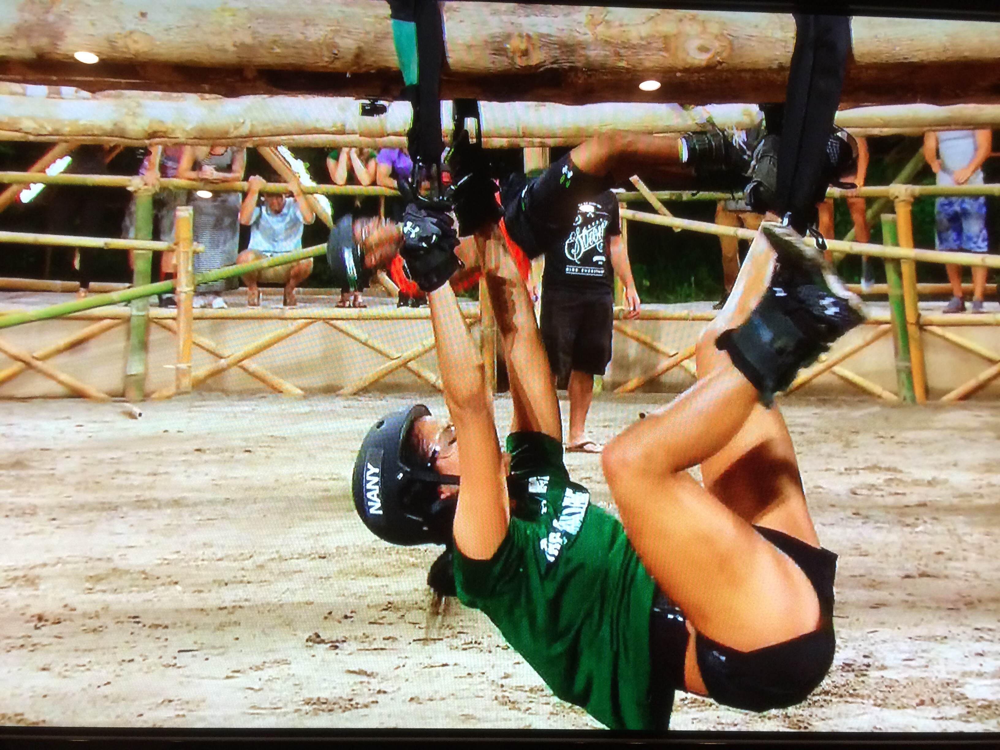 Dome time! “Strung Out” is the challenge. The players will be hanging by their hands and feet from a log. The first player will shimmy themselves by any means possible to the end of the horizontal log and back again. Then their partner will go and do the same. Whichever team finishes the relay first, wins. This looks painfully hard!! Girls take off first and Nia has a slight lead but then Nany comes out of nowhere and makes it to the bell first at the end. But the girls have to make it all the way back before the men can start and the girls are neck and neck. Nany then gets stuck and she begins to panic and it gives Nia the lead. Nia rings the bell and Leroy just takes off like it’s no big deal. It takes him just seconds to go to the end and back. Wow!! Johnny Bananas has been eliminated!! So happy for Wes!! Nany takes it really hard, but to Bananas’s credit, he’s very sweet to her and tells her that they wouldn’t have even been in there if it weren’t for him, so it wasn’t her fault they lost. However…. there is EXILE where they have a chance to come back. I wouldn’t be surprised if they take everyone out there and end up coming back for the final.